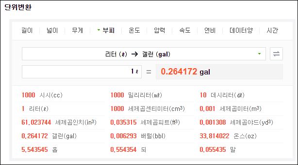 단위변환 표에서 보면 1리터는 1,000cc와 같고, 1,000ml와도 같은 것을 알 수 있습니다.