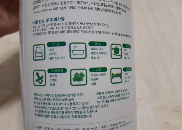 약국에서 파는 뿌리는 소독제 이름은 '균이팡'(Broad Spectrum Antiseptic Spray)이고요, 제가 산 건 500ml짜리입니다. 성분은 차아염소산수(Hypochlorite)이며 고준위 초산화수(활성유리염소 650~675ppm 이상 함유)로 피부 자극과 인체 유해 물질이 없다고 합니다.