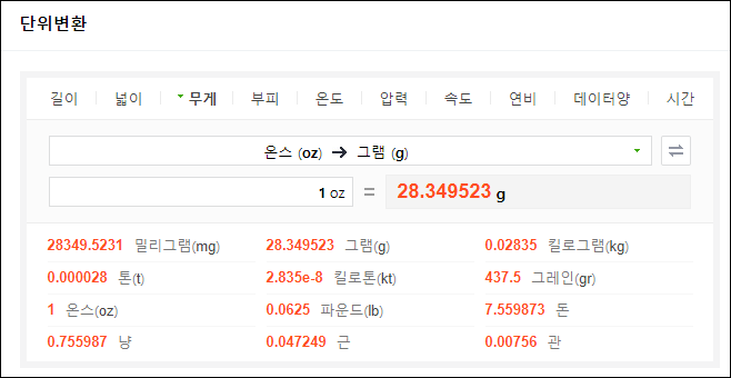 그런데 여기서 주의해야 할 것은 1온스 무게와 1트로이온스 무게가 조금 다르다는 것입니다.